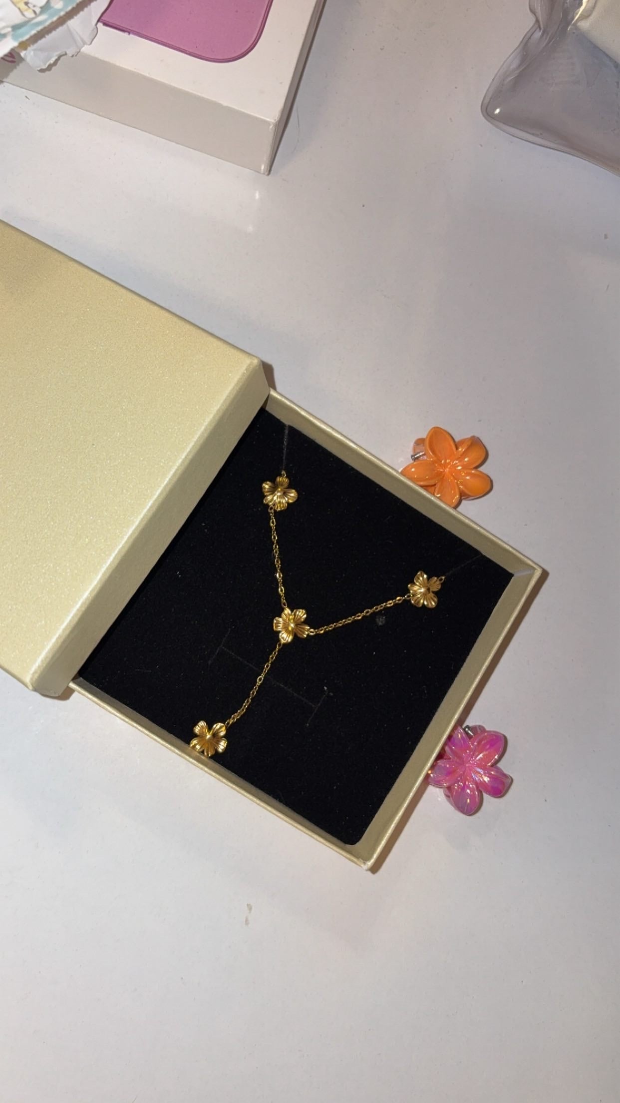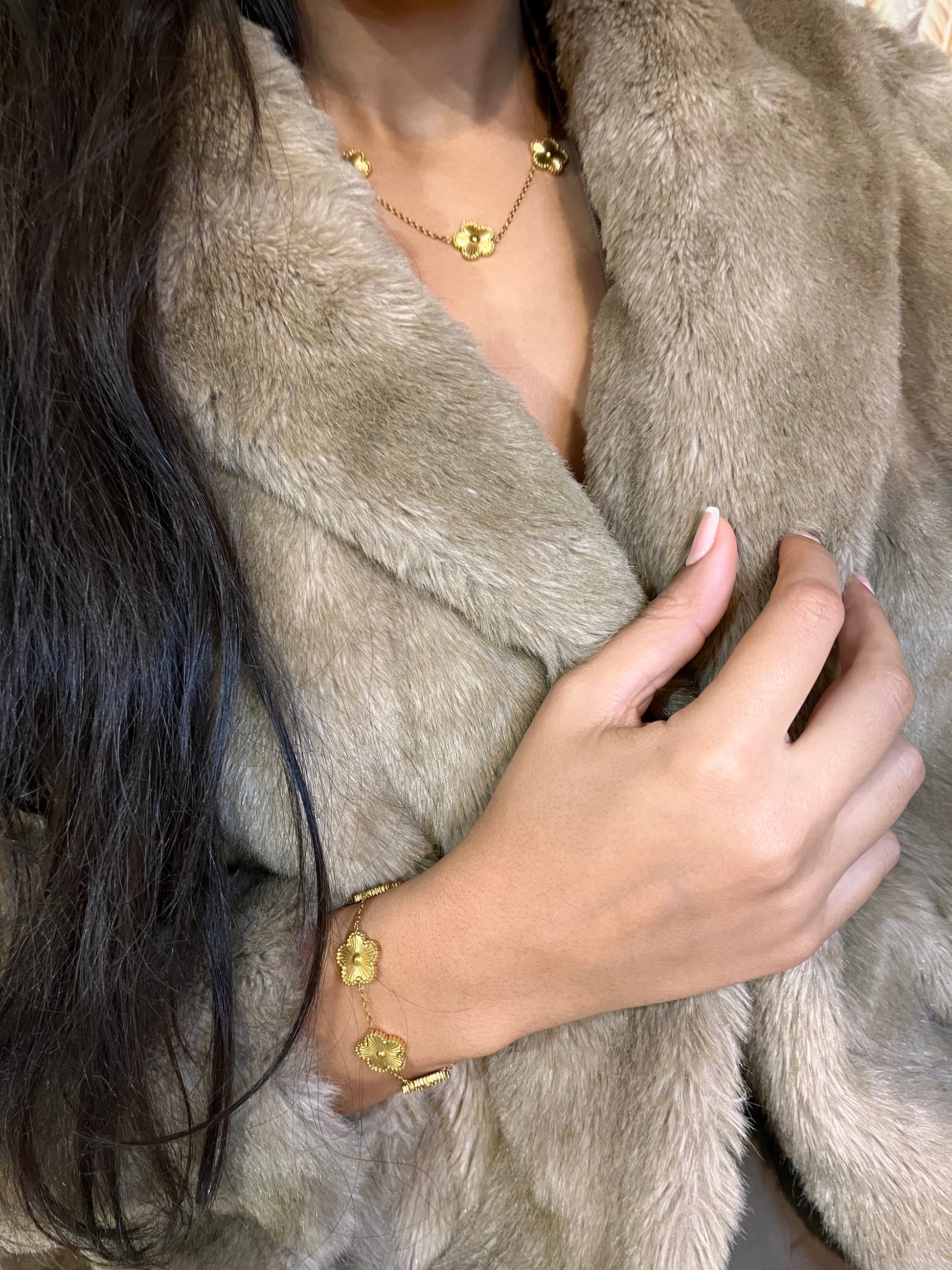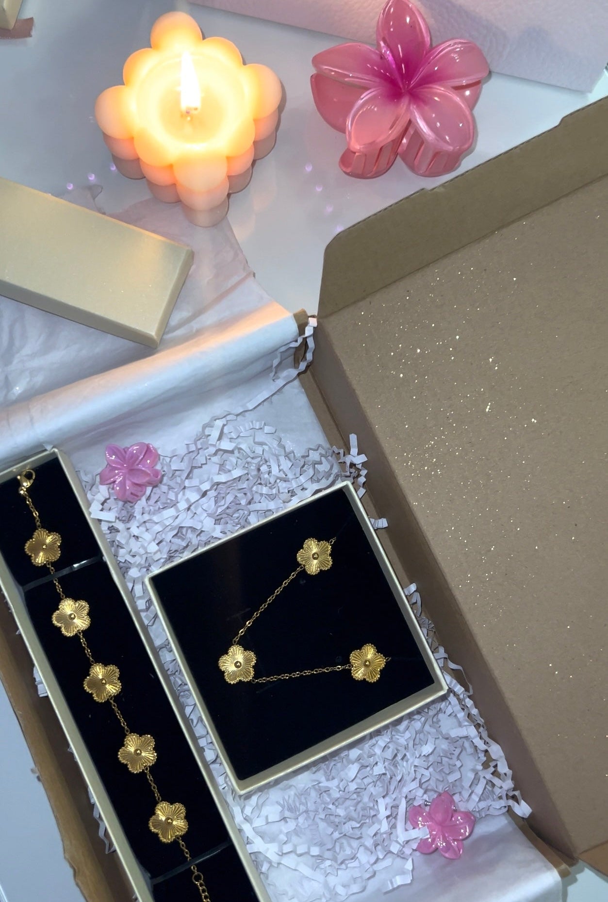 Le Set Liora réunit un bracelet doré et un collier doré, tous deux ornés de délicats trèfles, symboles de chance et d’élégance.