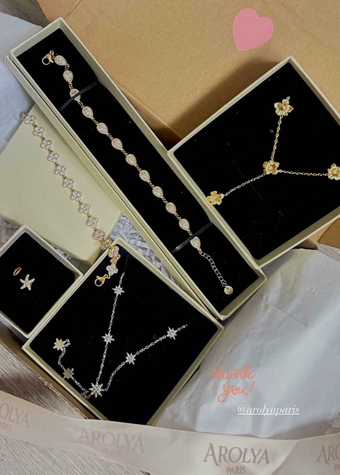 Parfait pour porter au quotidien ou pour sublimer une tenue sophistiquée, ce set reflète l’univers lumineux et précieux d’Arolya.